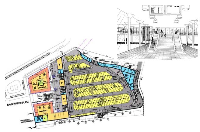 Direct and unrestricted transition to the parking decks with approx. 250 public parking spaces and to the railway station is possible with protection against weather influences. Access to the underground parking garage is possible via the railway station drive on Level 0, exit is accomplished with traffic signals via Level 2, next to the structurally separated exit of the bus terminal, located above the parking deck. The bus terminal can be reached through the Mall or via the upper main level via the stairway ascents and descents.